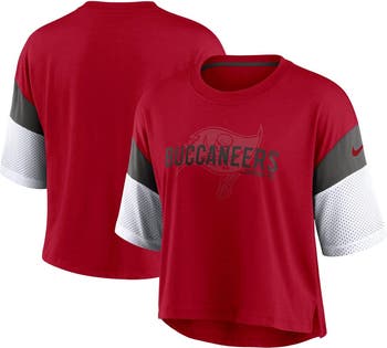 The Women's Nike Red/White Tampa Bay Buccaneers Nickname Tri-Blend Performance Crop Top is the perfect way to show your support for the Tampa Bay Buccaneers. Made from a comfortable polyester, rayon, and cotton blend, this top features a cropped body, dropped shoulder sleeves, and a droptail hem with side splits. Screen print graphics and solid inserts at the upper sleeve and mesh inserts at the sleeve hem add a touch of style. Whether you're cheering on the Buccaneers from the stands or relaxing at home, this top will keep you comfortable and stylish.