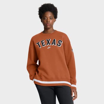 Stay comfy in trend-setting Texas Longhorns outerwear with this Oversized Legacy Phoenix Sweatshirt by Nike. The oversized silhouette and dropped shoulders create a roomy, relaxing fit and modern look. Cozy fleece fabric and brushed French terry lining provide a luxuriously soft feel and exceptional warmth, making this Texas Longhorns sweatshirt an essential for cold conditions.