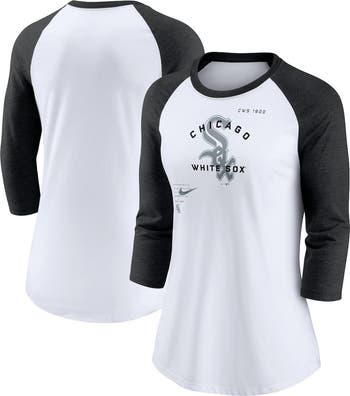 The Nike White/Black Chicago White Sox Next Up Tri-Blend Raglan 3/4-Sleeve T-Shirt is the perfect way to show your support for the Chicago White Sox. Made from a comfortable polyester, cotton, and rayon blend, this shirt features raglan sleeves and a rounded hem for a relaxed fit. The screen-printed graphics proudly display the Chicago White Sox logo, so you can show your team spirit wherever you go.