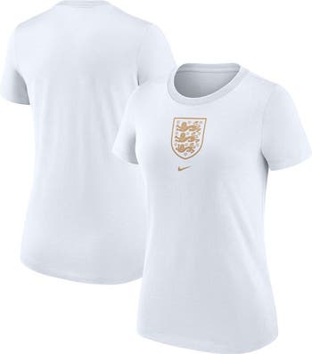 Celebrate your unwavering support for the England Women's National Team with the Women's Nike White England Women's National Team Crest Tri-Blend T-Shirt. This soft cotton tee features a crew neck and screen-printed graphics that proudly display the England Women's National Team crest, showcasing your allegiance to the Three Lions. Whether you're cheering from the stands or simply showing your support, this t-shirt is the perfect way to represent the England Women's National Team and the spirit of soccer.