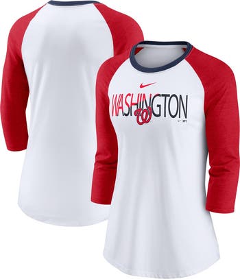 The Women's Nike White/Heathered Red Washington Nationals Color Split Tri-Blend 3/4-Sleeve Raglan T-Shirt is the perfect way to show your support for the Washington Nationals. Made from a soft and comfortable polyester, cotton, and rayon blend, this shirt features raglan sleeves and a rounded bottom hem for a relaxed and stylish fit. The screen-printed graphics proudly display the Washington Nationals logo, so you can show your team spirit wherever you go.