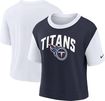 The Women's Nike White/Navy Tennessee Titans High Hip Fashion T-shirt is the perfect way to show your support for the Tennessee Titans. This cropped tee features screen-printed graphics of the Tennessee Titans logo, proudly displaying your team spirit. Made from soft cotton, this T-shirt offers all-day comfort, whether you're cheering on the Titans at the game or relaxing at home.