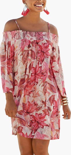 Pretty dress featuring a wide off-the-shoulder style neckline with adjustable spaghetti straps and a smocked insert.