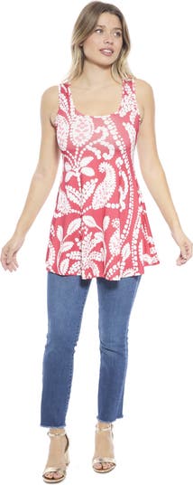 Add a playful pop to your casual wardrobe with this 24seven Comfort Apparel tank top featuring a vibrant red paisley print. The scoop neckline, sleeveless design, and flared below hip fit create a relaxed, flattering silhouette, while soft lightweight fabric keeps you comfortable all day. Machine washable, and perfect for layering or wearing on its own with ease.