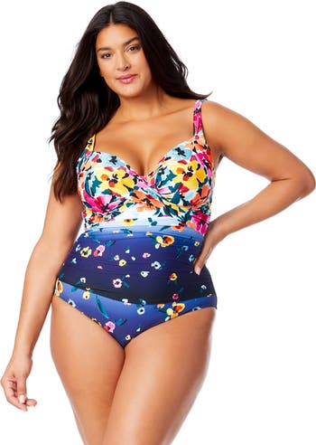Add a splash of color to your swimsuit this season with our Plus Size Gradient Floral Underwire Surplice One Piece Swimsuit, designed to highlight your best features Featuring a surplice neckline and a unique ombre floral print, this plus size one piece swimsuit has underwire construction and removable soft cups to provide a supportive, customizable fit. Pair this plus size swimsuit with an Anne Cole cover up and statement sunglasses for a memorable beach getaway look. Model wearing a size 16W
