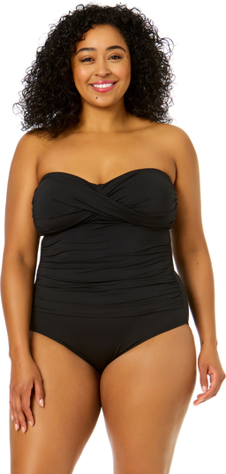 Get ready for a stylish summer beach vacation with our Plus Size Twist Front Shirred One Piece Swimsuit. This one piece features a bold solid solor that adds a vibrancy to your beach day. It offers adjustable, removable straps for versatile wear and built-in boning for enhanced shape and support. Silicone elastics around the top neckline ensure a stay-put fit when worn strapless. Molded cups provide comfort, and torso ruching creates a flattering contour. With full coverage, you can confidently enjoy beach and pool activities. Model is wearing a size 16w