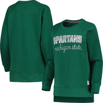 The Women's Pressbox Green Michigan State Spartans Steamboat Animal Print Raglan Pullover Sweatshirt is the perfect way to show your support for the Spartans. Made from a soft cotton and polyester blend, this midweight sweatshirt features a fleece lining for added warmth during chilly game days. Embroidered Michigan State Spartans graphics proudly display your allegiance, while raglan sleeves and thumbholes provide a comfortable and stylish fit. Whether you're cheering from the stands or simply showing your support, this sweatshirt is the perfect way to represent the Michigan State Spartans in style.