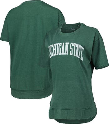 The Women's Pressbox Heather Green Michigan State Spartans Arch Poncho T-Shirt is the perfect way to show your support for the Spartans. Made from a soft cotton and polyester blend, this poncho features raw-edged inset seams and hems, as well as a rounded droptail hem for a stylish and comfortable fit. The Michigan State Spartans logo is proudly displayed on the front, so you can show your team spirit wherever you go.