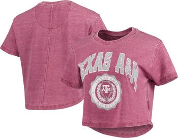 Celebrate your unwavering Texas A&M Aggies spirit with the Pressbox Women's Edith Vintage Burnout Crop T-Shirt. This stylish tee features unique burnout fabric and distressed screen-print graphics that proudly display your Aggies pride. The rounded droptail hem adds a touch of flair, making it the perfect choice for game days or any day you want to show your support for the Texas A&M Aggies.