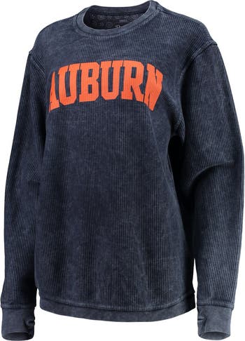 The Women's Pressbox Navy Auburn Tigers Comfy Cord Vintage Wash Basic Arch Pullover Sweatshirt is the perfect way to show your support for the Auburn Tigers. Made from soft, lightweight cotton, this sweatshirt is ideal for mild temperatures. The corded distressed fabric provides a vintage look, while the thumbholes in the cuffs keep your hands warm. Whether you're cheering on the Tigers at the game or relaxing at home, this sweatshirt ensures both comfort and style.