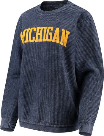 The Women's Pressbox Navy Michigan Wolverines Comfy Cord Vintage Wash Basic Arch Pullover Sweatshirt is the perfect way to show your support for the Michigan Wolverines. Made from soft and comfortable cotton, this sweatshirt features a vintage-inspired corded distressed fabric that gives it a unique and stylish look. The lightweight design makes it perfect for mild temperatures, and the pullover style makes it easy to get on and off. Plus, the thumbholes in the cuffs keep your hands warm on chilly days. Whether you're cheering on the Wolverines at the game or just relaxing at home, this sweatshirt is sure to become a favorite.