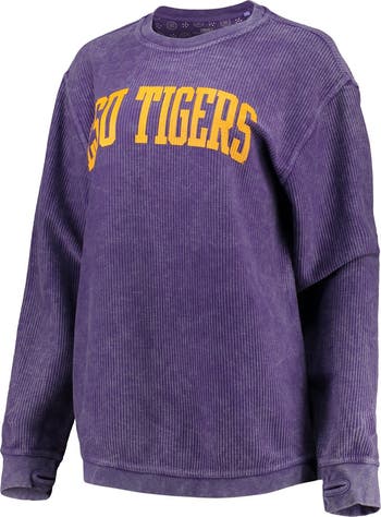 The Women's Pressbox Purple LSU Tigers Comfy Cord Vintage Wash Basic Arch Pullover Sweatshirt is the perfect way to show your support for the LSU Tigers. Made from soft and comfortable cotton, this sweatshirt features a vintage-inspired corded distressed fabric and a relaxed fit. The pullover design makes it easy to wear, and the thumbholes in the cuffs keep your hands warm on chilly game days. Whether you're cheering on the Tigers from the stands or just relaxing at home, this sweatshirt is a must-have for any LSU fan.