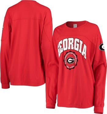 The Women's Pressbox Red Georgia Bulldogs Edith Long Sleeve T-Shirt is the perfect way to show your support for the Georgia Bulldogs. With its puffed screen print graphics, rib-knit collar and cuffs, this shirt is both stylish and comfortable. The side splits at the waist hem and thumb holes in the cuffs add a touch of functionality, making this shirt perfect for any Georgia Bulldogs fan.