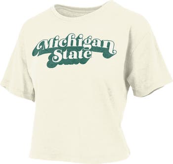 The Women's Pressbox White Michigan State Spartans Vintage Easy Team Name Waist-Length T-Shirt is the perfect way to show your support for the Michigan State Spartans. Made from a comfortable cotton and polyester blend, this t-shirt features screen print graphics and a rounded hem for a stylish look. Whether you're cheering on the Spartans at the game or just showing your team spirit, this t-shirt is a must-have for any Michigan State Spartans fan.
