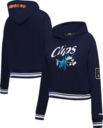 The Women's Pro Standard Navy LA Clippers 2023/24 City Edition Cropped Pullover Hoodie is the perfect way to show your support for the LA Clippers. This midweight hoodie is made of soft cotton and features heat-sealed fabric appliques with embroidered details, giving it a stylish and authentic look. The cropped design and thumbholes in the cuffs provide a comfortable and modern fit, making it perfect for game day or everyday wear. Whether you're cheering on the Clippers from the stands or just showing your team spirit, this hoodie is a must-have for any fan.