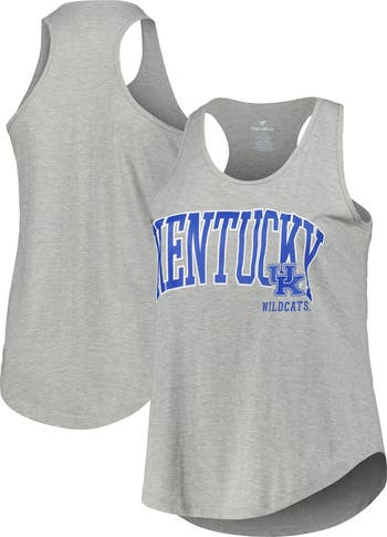 The Women's Profile Heather Gray Kentucky Wildcats Arch Logo Racerback Scoop Neck Tank Top is the perfect way to show your support for the Kentucky Wildcats. Made from a soft cotton and polyester blend, this tank top is comfortable and breathable, perfect for game day or any day. The racerback design and rounded droptail hem give this tank top a stylish look, while the screen print graphics proudly display your Kentucky Wildcats pride.