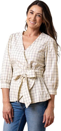 Our flattering wrap top combines a pretty sash with crisp cuffed sleeves for a beautiful feminine look. Features a gently curved hem, removable sash, full sleeves, hidden closures, and elastic at the back waist for the perfect fit.