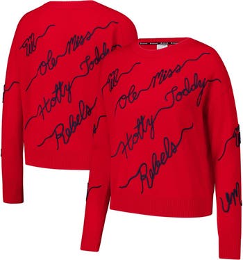Celebrate your Ole Miss Rebels fandom with this charming Love Note Embroidered Sweater. This cozy sweater is crafted from a blend of premium fabrics for a luxuriously soft feel. The dropped shoulders offer a relaxed fit, while the rib-knit collar, hem, and sleeve cuffs provide added comfort and warmth.