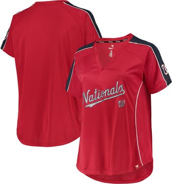 The Women's Red Washington Nationals Plus Size Diva Notch Neck Raglan T-Shirt is the perfect way to show your support for the Washington Nationals. This stylish and comfortable shirt features a decorative button at the collar, mesh side panels and sleeves, and a rounded droptail hem. The stitched fabric applique with glitter details adds a touch of flair, while the raglan sleeves provide a comfortable fit. Made from durable polyester, this shirt is perfect for any Washington Nationals fan.