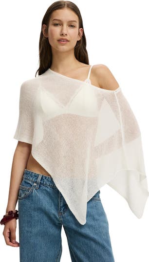 The sheer knit poncho drapes effortlessly, with textured lace and off-shoulder detail that reveals just enough.