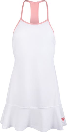 The Shirley Dress is a lightweight, UV-protective Lycra spandex sleeveless athletic dress designed for movement and performance. Featuring a built-in bra for support, a flirty flared hem for ease of motion, and a light pink cross-band racerback for a feminine finish, this piece balances comfort with style. Completed with our signature embroidered crossed heart logo on the back. Made in the U.S. Named for Shirley Fry Irvin, one of only ten women to complete the career Grand Slam, this dress embodies her strength and versatility, reimagined in a modern performance silhouette.