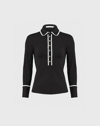 - Model is 170 cm / 5'9" and is wearing a size 38 Black Pima cotton shirt with peter pan collar and pearl front buttons 1/2 front button placket Pullover style Body: 92% Cotton, 8% Elastane Trim: 97% Cotton, 3% Elastane Follow care instructions on garment Anne Fontaine Essentials Collection