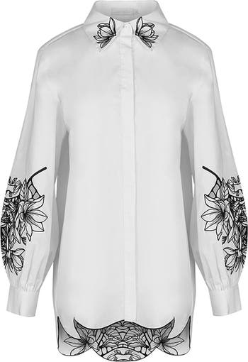 Women's Shirt Leonie White Long Sleeve Cotton Poplin Shirt With Black Embroidered Flowers