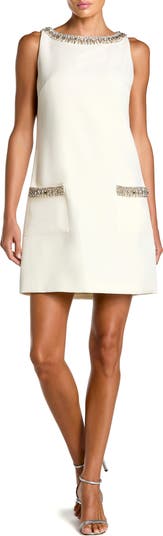 Chic and modern, this crepe mini dress features a rhinestone-trimmed boat neckline and matching pocket accents for a polished, elevated look.