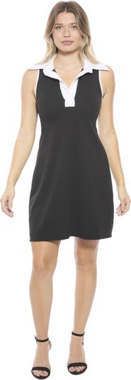 Make a bold statement in the black sleeveless collared mini dress from 24seven Comfort Apparel. Featuring a white classic collared neckline and a relaxed, flared fit, this lightweight dress offers effortless style. Crafted from soft, slightly textured stretch fabric with a subtle structured drape, the mini length hemline keeps the look modern and playful. Perfect for casual outings or dressed up events. Machine washable and tumble dry for easy care.
