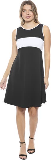 This sleeveless knee length dress from 24seven Comfort Apparel features a classic round neckline and a relaxed A Line fit that flows gently for effortless comfort. Slightly flared for easy movement, it is accented with a bold white stripe across the bust. Made from smooth, slightly textured fabric with a lightly structured look, it is machine washable and tumble dry for simple care.