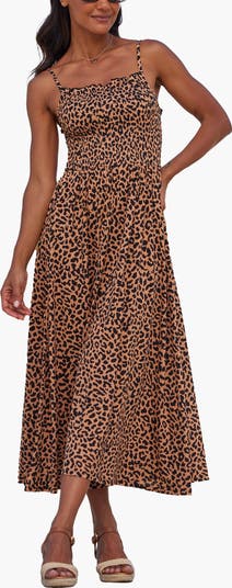This feminine midi dress with a leopard print flows in a fashionable length.