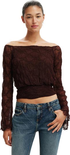 The Sofia lace long sleeve top is impossible to ignore, this off-shoulder lace top features textured lace with a mesh lining, flared sleeves, and a sculpting basque waist panel.