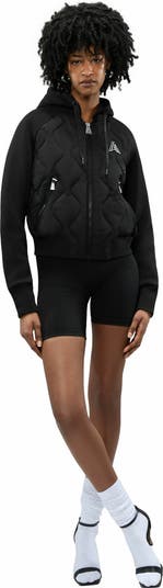 Transition effortlessly through seasons with our versatile bomber featuring a removable hood, sporty raglan cut, intricate wave stitching pattern, and soft scuba combo material for comfort and style in any setting.