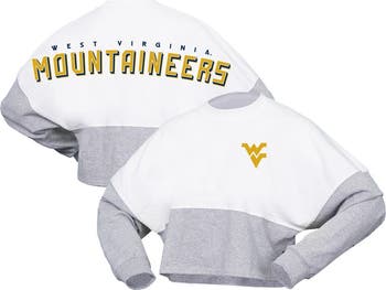 The Women's Spirit Jersey White West Virginia Mountaineers Heather Block Cropped Long Sleeve Jersey T-Shirt is the perfect way to show your support for the West Virginia Mountaineers. With its low-puff screen-print graphics, dolman sleeves, and drop shoulders, this jersey is both stylish and comfortable. The cropped waistline and ribbed collar and cuffs add a touch of sophistication, while the oversized fit ensures a relaxed and comfortable feel. Made from a blend of cotton and polyester, this jersey is perfect for any occasion, whether you're cheering on the Mountaineers at the game or just relaxing at home.