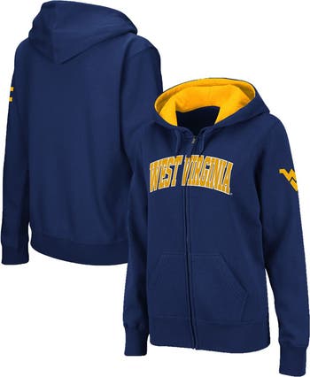 The Women's Stadium Athletic Navy West Virginia Mountaineers Arched Name Full-Zip Hoodie is the perfect way to show your support for the West Virginia Mountaineers. Made from a comfortable cotton and polyester blend, this midweight hoodie features a fleece lining for added warmth during chilly game days. Embroidered fabric applique, rib-knit cuffs, and waist hem add a touch of style, while the two front pockets provide convenient storage for your essentials. Whether you're cheering from the stands or simply showing your support, this hoodie is the perfect way to represent the West Virginia Mountaineers in style.