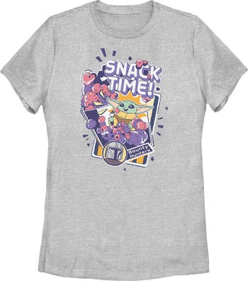 - Experience the thrill of the galaxy with this new women's t-shirt that is perfect for fans who know that "this is the way" to stay stylish! Featuring Grogu enjoying space popcorn with the statement "Snack Time!" printed above and a small photo of The Mandalorian at the bottom.