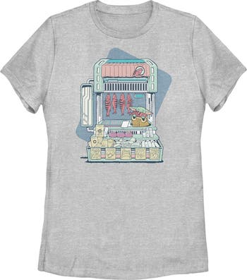 Experience cuteness like never before in a galaxy far, far away! Get ready for an epic journey by packing your favorite snacks and snagging this officially licensed The Mandalorian and Grogu apparel! This charming Women's The Child Street Stall Graphic T-Shirt features Grogu at a retro space-food stall, looking utterly adorable as he enjoys his newest treat—a fish. Don't let your style go unnoticed! Grab this awesome tee and let your craving for adventure take off!