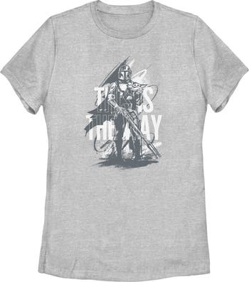 - Experience the thrill of the galaxy with this stylish new women's t-shirt! Featuring The Mandalorian standing tall, with Grogu nestled beside him, and the legendary "This Is the Way" quote, all portrayed in an artistic sketch style.