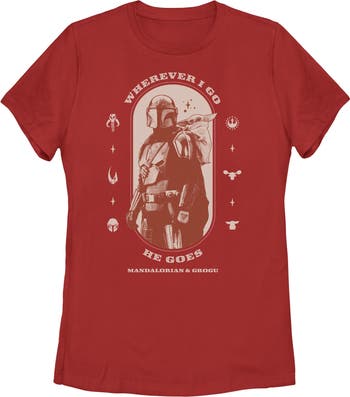 - Protect the galaxy with this women's t-shirt that will look perfect alongside the New Republic! Featuring The Mandalorian, Grogu, and the text "Whenever I Go, He Goes" printed across the front.