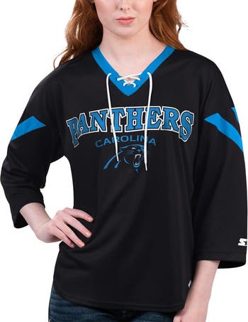 The Women's Starter Black Carolina Panthers Rally Lace-Up 3/4 Sleeve T-Shirt is the perfect way to show unwavering support for the Carolina Panthers. Screen print graphics and sewn-on sleeve stripes proudly display team spirit. The V-neck, lace-up neckline adds style, while the rounded droptail hem provides a comfortable fit. Made from durable polyester, this T-shirt is perfect for cheering on the Panthers at the stadium or showing support around town.