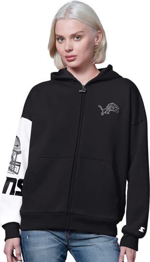 Stay warm and show your Detroit Lions pride with this 4th Down Full-Zip Hoodie from Starter. With its fleece lining, this hoodie provides added warmth and a soft feel, making it perfect for chilly game days. The team logo embroidered at the left chest and the team helmet graphic printed on the contrast-color right sleeve display your Detroit Lions pride in style.