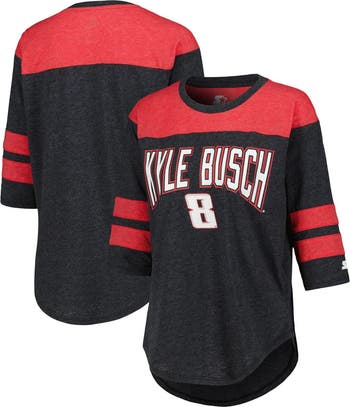 The Women's Starter Black Kyle Busch Full Back Block 3/4-Sleeve Tri-Blend Top is the perfect way to show your support for Kyle Busch and the NASCAR community. Made from a comfortable polyester, cotton, and rayon blend, this top features screen print graphics of Kyle Busch's iconic number and name, as well as sewn-on stripes for a sporty touch. The rounded droptail hem adds a stylish finishing touch, making this top perfect for any Kyle Busch fan.