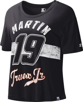 The Women's Starter Black Martin Truex Jr Record Setter T-shirt is a must-have for any Martin Truex Jr fan. This stylish tee features a cropped hem and is made from a comfortable cotton and polyester blend. Show your support for Martin Truex Jr and NASCAR with this officially licensed t-shirt.