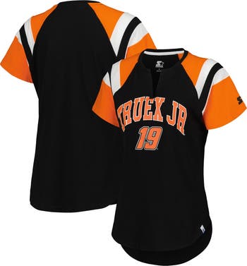Celebrate your unwavering support for Martin Truex Jr with the Women's Starter Black/Orange Martin Truex Jr Game On V-Neck T-Shirt. This stylish tee features the official Martin Truex Jr logo, proudly displaying your allegiance to the NASCAR legend. The droptail hem adds a touch of flair, while the cotton and polyester blend ensures comfort and durability. Whether you're cheering from the stands or simply showing your support, this t-shirt is the perfect way to represent Martin Truex Jr and NASCAR.