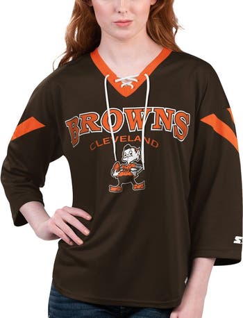 The Women's Starter Brown Cleveland Browns Rally Lace-Up 3/4 Sleeve T-Shirt is the perfect way to show your unwavering support for the Cleveland Browns. With screen-print graphics and sewn-on sleeve stripes, this T-shirt proudly displays your team spirit. The V-neck and lace-up neckline add a touch of style, while the rounded droptail hem provides a comfortable fit. Made from durable polyester, this T-shirt is perfect for cheering on the Browns at the stadium or just showing your support around town.