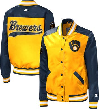 Stylishly rep the Milwaukee Brewers with The Legend jacket from Starter. Sleek appliques embroidered on the front and back show off your loyalty to the Milwaukee Brewers. Plus, rib-knit stripes in team colors make this full-snap a timeless piece in your collection.