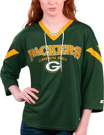 The Women's Starter Green Green Bay Packers Rally Lace-Up 3/4 Sleeve T-Shirt is the perfect way to show your unwavering support for the Green Bay Packers. With its screen-print graphics and sewn-on sleeve stripes, this shirt proudly displays your team spirit. The V-neck and lace-up neckline add a touch of style, while the rounded droptail hem provides a comfortable fit. Made from durable polyester, this shirt is perfect for any Green Bay Packers fan.