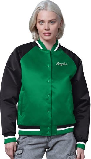 Relive the glory days of the Philadelphia Eagles with this vintage-inspired Starter Satin Full-Snap Vintage Varsity Jacket . This eye-catching jacket pays homage to the team's rich history with its throwback logo appliqu on the back and embroidered team name on the chest. The satin fabric offers a lustrous finish, while the relaxed fit ensures comfort and freedom of movement. Perfect for moderate temperatures, this midweight jacket features a tri-color, rib-knit stand-up collar, cuffs, and hem, along with two side pockets for convenient storage. A locker loop adds a touch of practicality, making it a must-have for any fan looking to showcase their team pride in retro fashion.