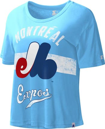 Celebrate your unwavering support for the Montreal Expos with the Women's Starter Light Blue Montreal Expos Cooperstown Collection Record Setter Crop Top. This stylish crop top features distressed screen-print graphics that pay homage to the Expos' iconic logo and colors. The crew-neck collar and rounded, cropped hem add a touch of modern flair, making it the perfect way to show your Expos pride both on and off the field.