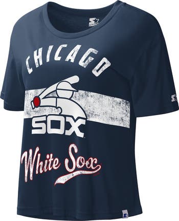 The Starter Women's Navy Chicago White Sox Cooperstown Collection Record Setter Crop Top is a must-have for any devoted White Sox fan. With its distressed screen-print graphics and rounded, cropped hem, this top is perfect for showing off your team spirit in style. The crew-neck collar and cotton-polyester blend provide comfort and durability, making it a great choice for game day or any day.
